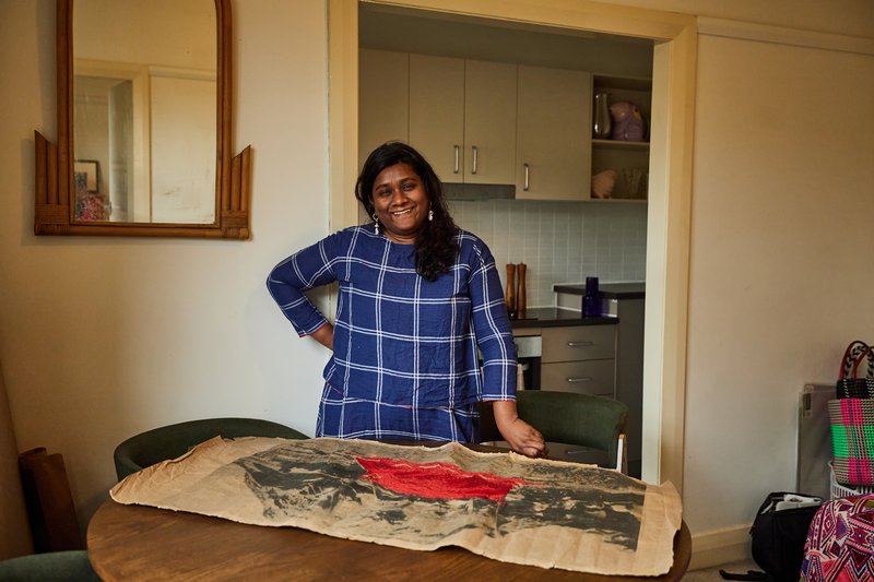 ID: A photo of Shivanjani Lal, she is leaning with one hand on her hip and the other resting on a dining table. She wears a blue checkered dress and is smiling at the camera. Spread across the table in front of her is an artwork printed on fabric featuring a dark image overlaid with a bold red shape. Behind her is a kitchen and a wooden-framed mirror.