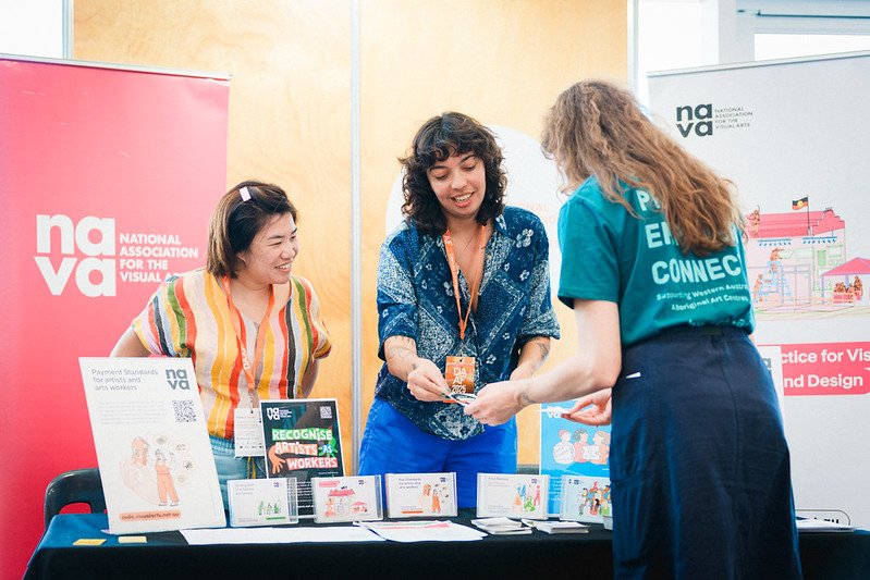 ID: Three people stand at a NAVA (National Association for the Visual Arts) information stall, smiling and exchanging printed materials across a display table. The table features brochures, postcards and signage including “Recognise Artists as Workers” and “Payment Standards for artists and arts workers.” A pink NAVA banner stands behind the table, alongside another banner referencing the Code of Practice for Visual Arts, Craft and Design.