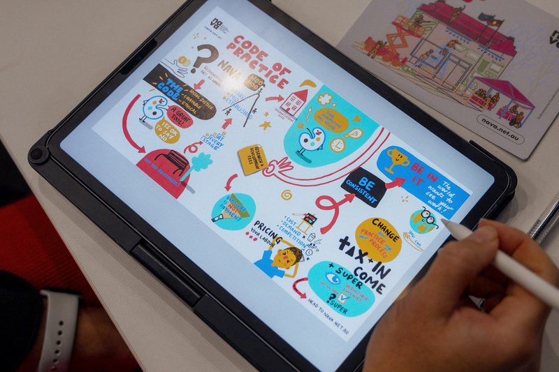 ID: A close-up of a tablet on a desk displaying a colourful illustrated summary of NAVA’s Code of Practice. A hand holding a stylus is drawing parts of the digital illustration, which includes icons, arrows and phrases such as “Code of Practice,” “pricing your labour,” “change takes practice,” and “tax + income + super.” A Code of Practice postcard with an illustrated arts scene sits on the table in the background.
