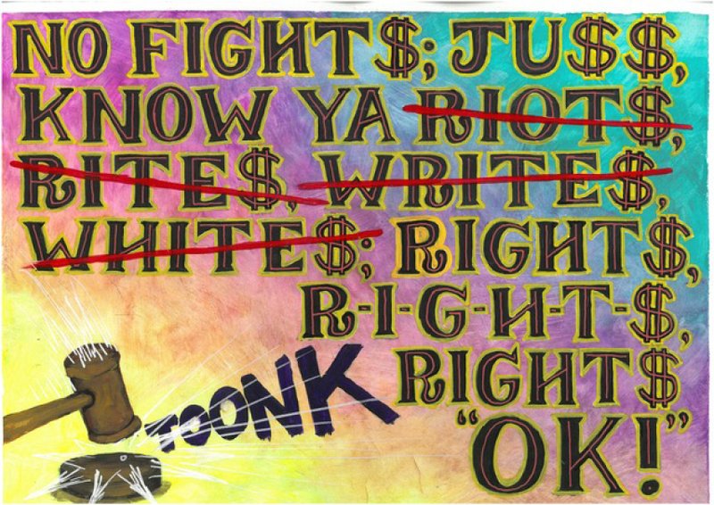 ID: Coloured pencil illustration on a rainbow gradient background. Bold handwritten message reads “No fight$; ju$$ know ya riot$, rite$, write$, white$; right$, right$, right$ “OK!”” with some words crossed-out with a thick red line. A judge’s gavel hits a desk below.
